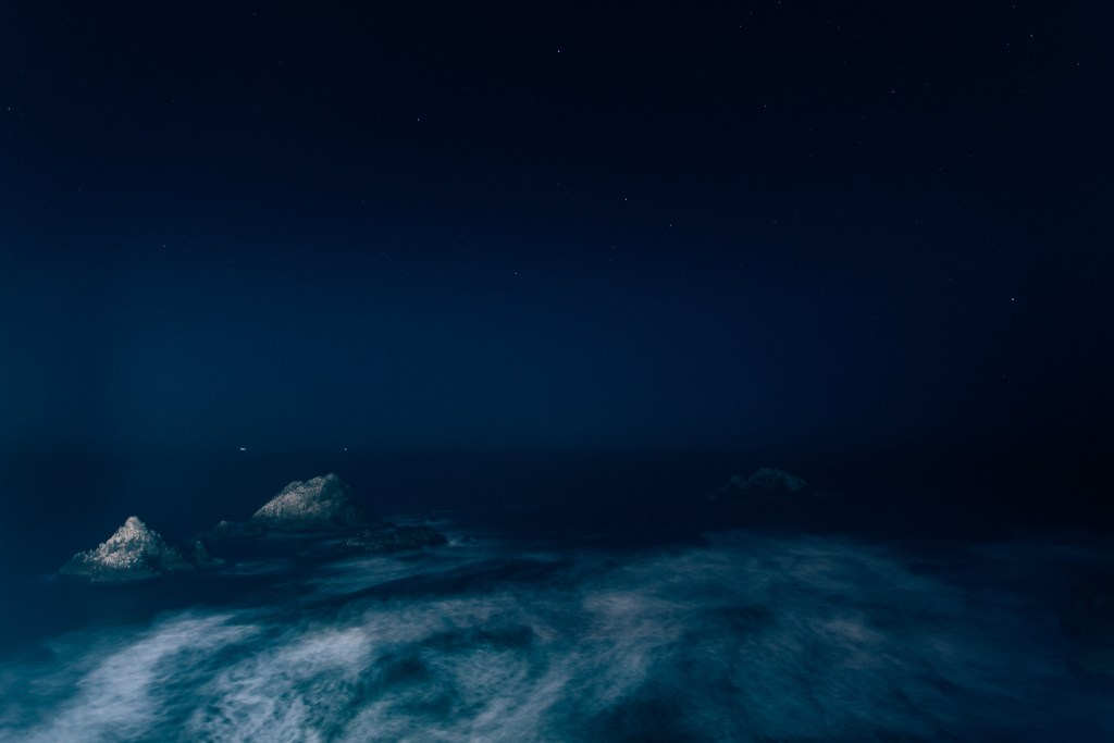 Ocean view at night with a long shutter, ships on the horizon. The view from the camera obscura can be quite the sight at night. The camera obscura is on a hill overlooking the nature around San Francisco.