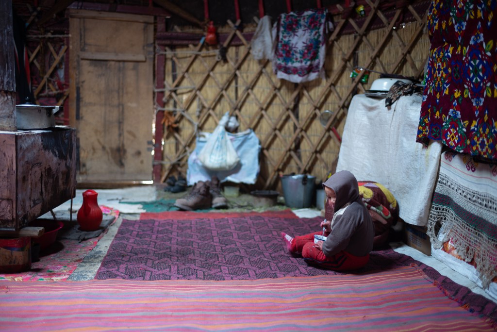 In the mountain regions of Central Asia, nomads live in yurts. Yurts are round portable structures made of wood and felt, designed to withstand the harsh environment. These nomads move from place to place with livestock, such as cattle, yak, and sheep, which provide them with food and other resources. Some of these nomads sell yogurt traditionally made from the milk of their livestock and snacks to tourists who visit the region for hiking and mountain excursions. The image features one of such yurts. On our tour, we stopped over here for some snacks and yogurt and couldn’t help taking a picture. Also, many yurts have become resting spots for travelers in need of a break or wanting to experience local culture.